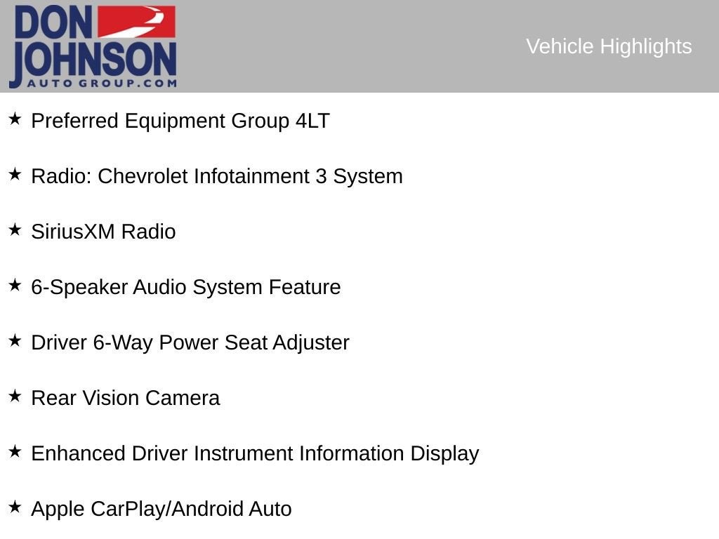 Recent Arrival! Clean CARFAX. 6-Speaker Audio System Feature, Apple CarPlay/Android Auto, Driver 6-Way Power Seat Adjuster, Enhanced Driver Instrument Information Display, Preferred Equipment Group 4LT, Radio: Chevrolet Infotainment 3 System, Rear Vision Camera, SiriusXM Radio.