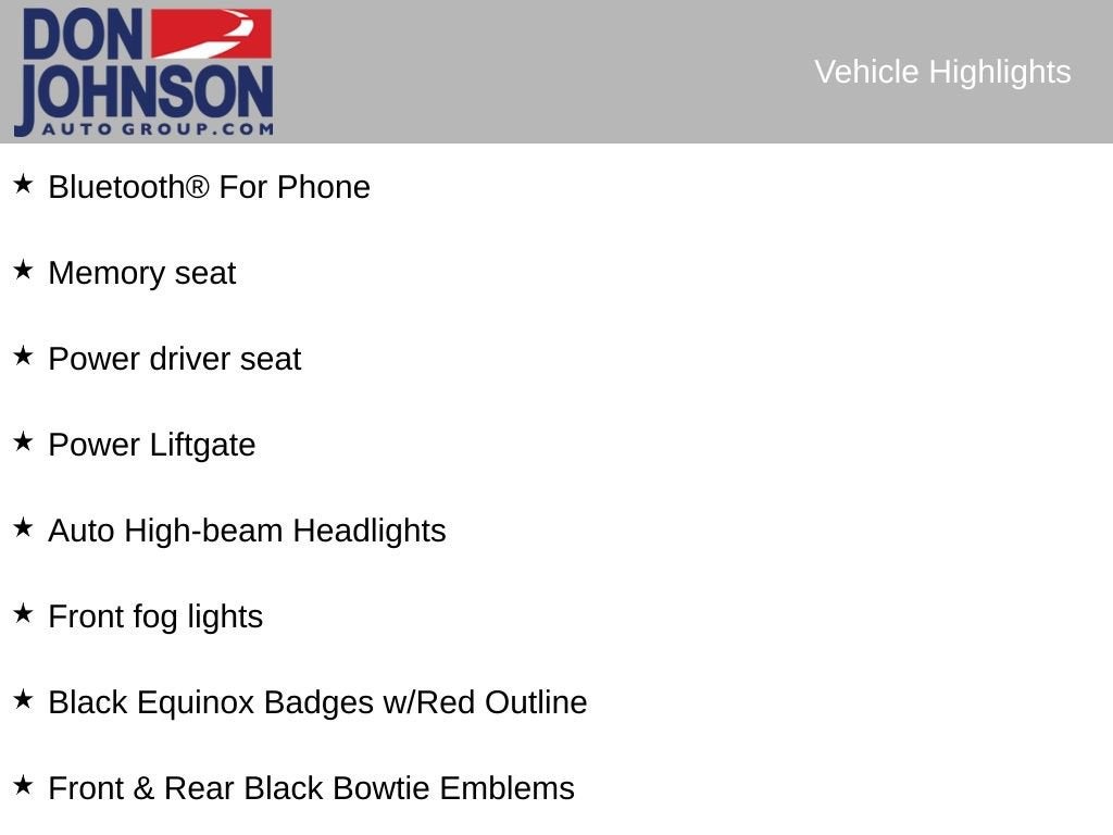 Recent Arrival! Clean CARFAX. CARFAX One-Owner. 25/30 City/Highway MPG 19 Aluminum Wheels, 2 Rear USB Charging-Only Ports, 2 USB Data Ports, 2 USB Data Ports w/SD Card Reader, 6 Speaker Audio System Feature, All-Weather Floor Liners (LPO), AM/FM radio: SiriusXM, Apple CarPlay/Android Auto, Auto High-beam Headlights, Black Equinox Badges w/Red Outline, Bluetooth® For Phone, Floor Liner Package (LPO), Front & Rear Black Bowtie Emblems, Front dual zone A/C, Front fog lights, Garage door transmitter, Heated front seats, Integrated Cargo Liner (LPO), Memory seat, Mosaic Black Mirror Caps, Perforated Leather-Appointed Seat Trim, Power driver seat, Power Liftgate, Preferred Equipment Group 1LZ, Radio: Chevrolet Infotainment 3 Plus System, Redline Edition, Redline Specific Grille, SiriusXM Radio.